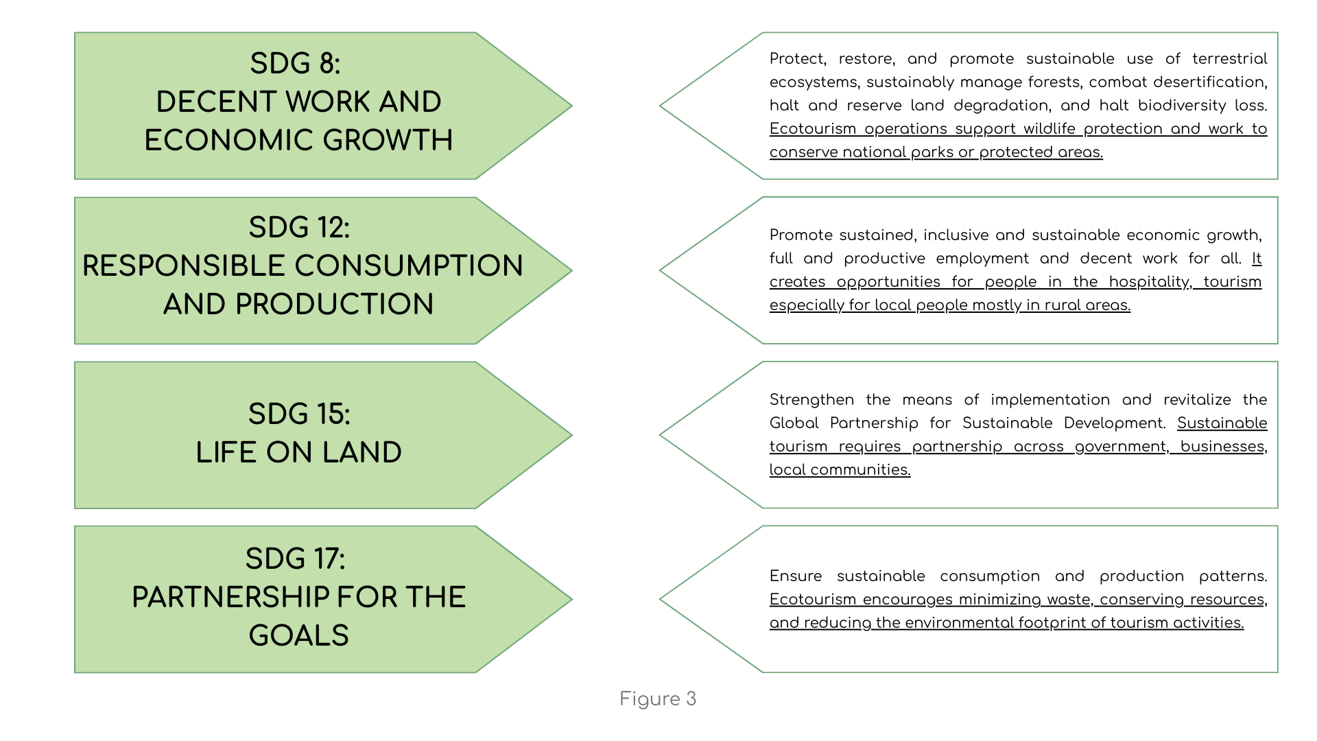 Ecotourism is somehow linked to almost all the Sustainable Development Goals (SDGs), with some key ones closely related to Ecotourism. Please match the related SDGs with the United Nations’ description and example: