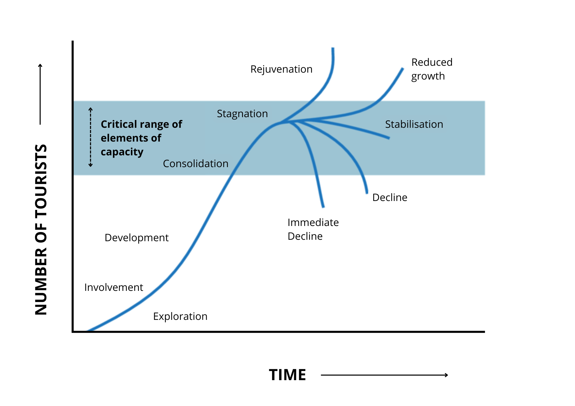 The Butler Destination Life Cycle Model offers a useful framework for understanding the evolution of tourism destinations (from exploration to consolidation) and how sustainable practices can be integrated at each stage. In the early stages, investing in sustainable tourism helps avoid future issues like congestion and environmental degradation, maximizing long-term benefits. Although the model has been criticized for its simplicity, it remains a valuable reference for tourism development (Tamanine & Houssas, 2023).